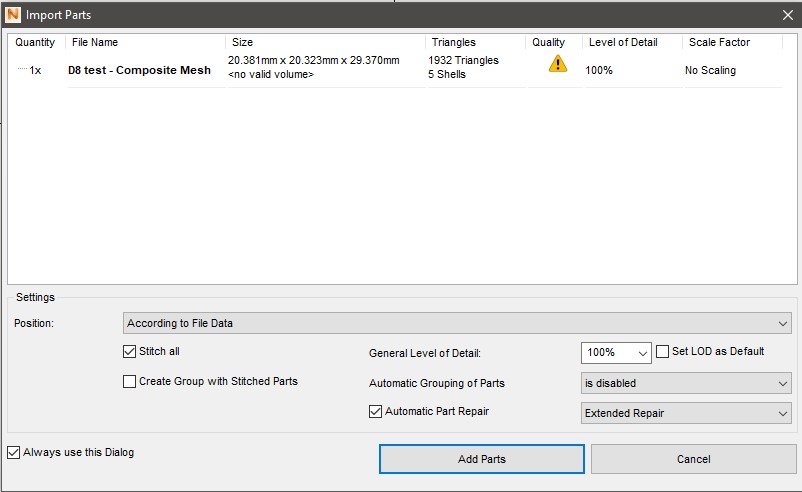 Exporting a D8 and then immediately, before anything else, dragging it into Netfabb displays the following:
